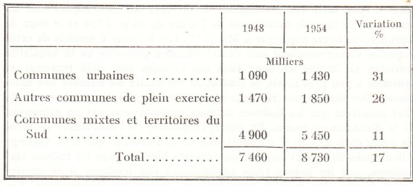 a) La population non musulmane a tendance à se concentrer davantage dans les grandes villes (en 1954, 77 % des Européens vivaient dans les 46 communes de caractère urbain) d'où une structure professionnelle particulière : 1,6 % de primaires (25 000 exploitants plus 17 000 salariés environ) ; 34 % de secondaires (cadres et ouvriers du secteur industriel ou artisanal) ; 50 % de tertiaires (fonctionnaires, professions libérales et commerciales essentiellement). La population non musulmane est encore relativement très jeune, malgré les effets rapides de la baisse de la fécondité : sa structure par âge actuelle se compare à celle de la population française vers 1866 : 35 % de moins de 20 ans ; 54 % d'adultes ; 11 % de plus de 60 ans. b) La population musulmane reste encore essentiellement rurale en dépit de l'augmentation rapide, surtout depuis la fin du dernier conflit, de la population des grandes communes urbaines. En limitant la comparaison aux deux derniers recensements, on donnera la répartition par grandes catégories de communes (nombres corrigés).
