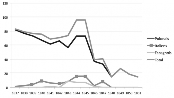 La première remarque qu'appelle ce graphique (page suivante) est le faible nombre de réfugiés secourus domiciliés à Alger, dont l'effectif, essentiellement composé de Polonais, ne dépasse jamais la centaine de personnes. La forte présence des Polonais en Algérie s'explique par la large majorité qu'ils représentent alors parmi les réfugiés subventionnés en métropole : ils forment en effet plus des trois-quarts des effectifs à partir du milieu des années 1830 51, et en 1850 leur part atteint même les 94 % 52. Quant aux effets quantitatifs de la politique d'incitation sur le nombre de réfugiés secourus établis à Alger, on peut constater que leur présence reste stable au long des années 1838-1843 et avoisine toujours les 70 personnes. Puis, le groupe s'étoffe, frôlant la centaine d'individus, accroissement que l'on peut imputer aux effets de la circulaire de février 1842 octroyant le transport gratuit à tous les réfugiés. Le nombre d'étrangers bénéficiant de secours à Alger s'effrite nettement au milieu de la décennie, passant de 96 personnes en 1845 à seulement 40 l'année suivante, avant de décliner encore jusqu'à la fin de la Seconde République. Toutefois, les registres de dépôts laissent dans l'ombre la population des exilés non secourus, particulièrement nombreux parmi les étrangers débarqués à Alger 53. Aussi, le déclin du nombre de réfugiés relevant du dépôt d'Alger peut autant être attribué à des départs hors de la colonie qu'à une diminution du nombre d'individus qui y bénéficient d'une aide financière. À partir de 1843, les réfugiés bénéficiant de secours à Alger voient le niveau de leurs subsides baisser, quand ceux-ci ne sont pas tout bonnement supprimés, à la demande du ministère de l'Intérieur qui souhaite par ce biais mettre les réfugiés au travail 54. Sauf exception, les exilés accueillis dans la colonie après 1845 n'obtiennent pas la faveur des secours.