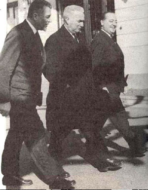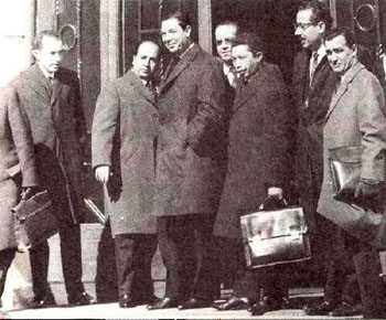 La délégation française à Evian (à gauche) : Robert Buron, Jean de Broglie et Louis Joxe. La délégation algérienne (à-droite) : Saad Dahlab, Krim Belkacem, Aziz Ben Tobbal, Yazid, Malek, Ben Yahia et Ahmed Francis. En signant ces accords, le gouvernement français s'inclinait devant les exigences du F.L.N. : la France reconnaissait l'indépendance algérienne, liée au cessez-le-feu; ne réclamait pas de statut particulier définitif pour les Français d'Algérie ; admettait l'intégration du Sahara à l'Algérie. |