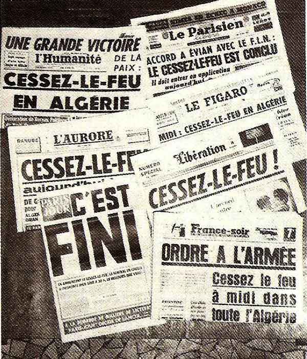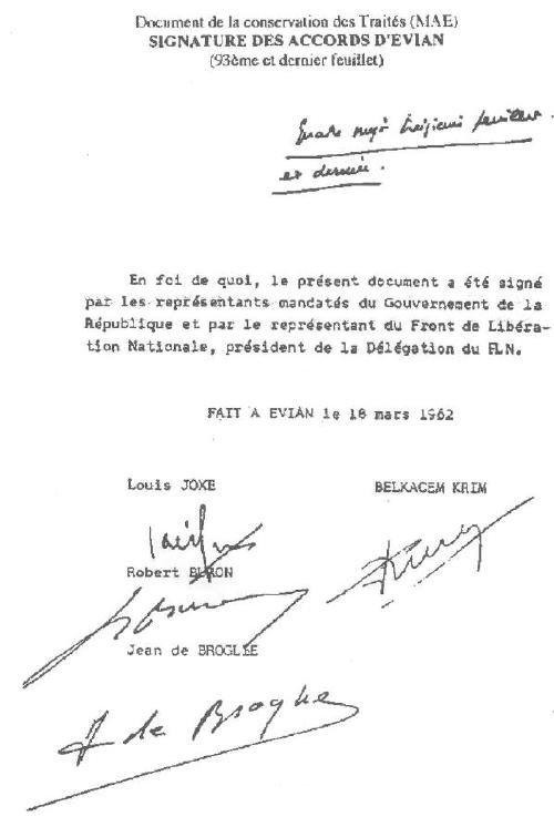 Le 31 janvier 1962, le général de Gaulle avait désigné trois négociateurs pour traiter avec le F.L.N., représenté par Krim Belkacem, Saad Dhalab et Aziz Ben Tobbal. Il s'agissait de Louis Joxe, Robert Buron et Jean de Broglie. Le 18 mars, les accords étaient signés; le 19 à midi, le cessez-le-feu devait entrer en vigueur; le lendemain, « accord de cessez-le- feu » et « déclarations gouvernementales» étaient publiés dans le Journal officiel. L'indépendance de l'Algérie, l'intégrité de son territoire et l'unité de son peuple étaient reconnues. La France obtenait des garanties sur la sécurité des personnes et des biens des Français d'Algérie, sur la présence des troupes françaises sur le territoire algérien pendant plusieurs années, sur la coopération économique, financière, culturelle et technique... des garanties qui ne seront pas toujours (jamais) tenues. (Historama Hors série N°18)