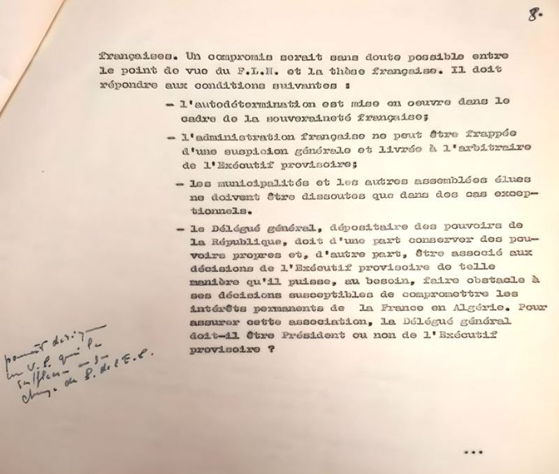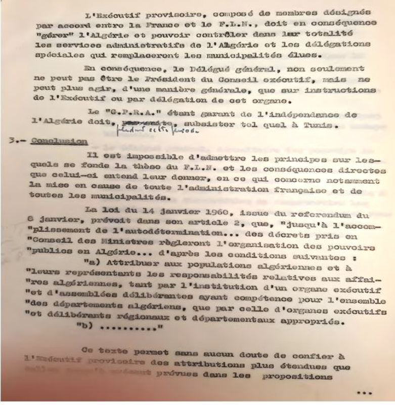 Le document ci-dessous résume en une demi-page la vision FLN-France sur la décolonisation sous souveraineté française, et surtout sur la composition et la nature de l'exécutif provisoire qui se substituera au Gouvernement provisoire de la République algérienne (GPRA):