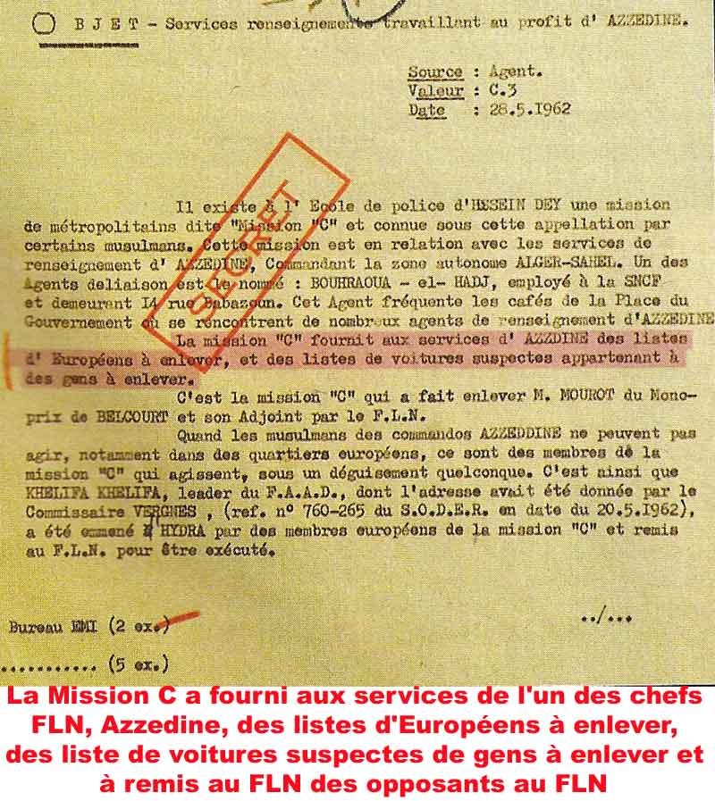 responsables FLN. Il est utile de signaler à cet effet qu'un nommé Lemarchand, connu pour diriger certains groupes communément désignés sous l'appellation de " barbouzes " effectue de fréquents voyages entre l'Algérie et la métropole sous une fausse identité ". Au-dessus et encore plus mystérieuse que les barbouzes : la Mission C pour " choc ".