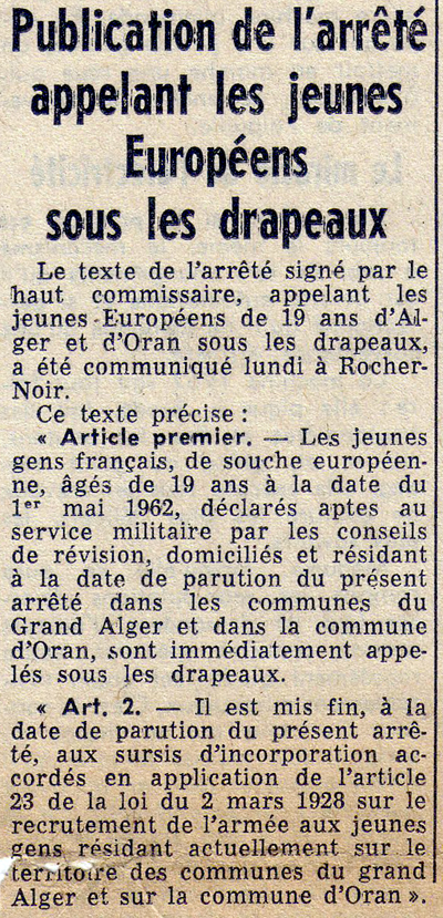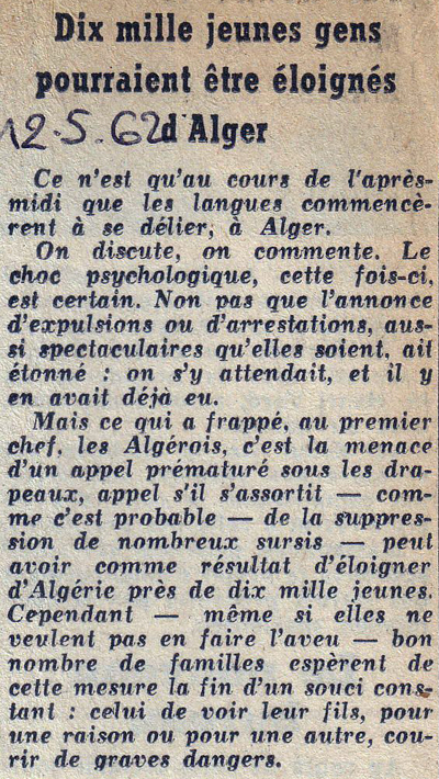 Enfin, les autorités militaires multiplient les fouilles des jeunes FSE habitant Alger et Oran, déjà importantes au mois de mai. En effet, d'une part, le préfet de police d'Alger, Vitalis Cros, affirme que dans le seul mois de mai, il eut 472 arrestations de tueurs ou de plastiqueurs et plus de 30 000 armes saisies 45. L'ordonnance no 62-908 du 4 août " relative aux obligations militaires des jeunes gens de statut civil de droit commun en Algérie " 48 est destinée à appliquer cet article. Elle démontre, de nouveau, sans ambages que le plan Simoun était un prétexte, temporaire, destiné à éloigner la jeunesse FSE de l'action de l'OAS en Algérie. Paradoxalement, à Alger dans une ville vidée de sa jeunesse, une session de rattrapage était proposée aux étudiants. Le décret du 30 juin, émis par le ministre de l'Éducation nationale Pierre Sudreau, stipulait l'organisation d'une session spéciale d'examens au début du mois de novembre 49. Plusieurs jeunes hommes ne sont, effectivement, pas retournés en Algérie, leur terre natale, depuis leur transfert outre-mer. Ainsi en témoigne le poème d'un appelé anticipé : " Ce triste 21 juin 1962, le soleil plombe mais tout est flou, mes yeux s'embrument, les larmes coulent et je ne peux pas lutter. À travers les brumes de ma vue, là-bas Oran n'est plus qu'une tache floue. Oran, Oran de ma jeunesse. " 50 Un symbole du non-retour ?
