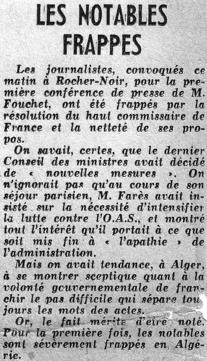 " Rien de grand, rien d'important ne peut être fait si l'ordre public n'est pas maintenu ", affirme le haut-commissaire de la République en Algérie Christian Fouchet dont l'objectif est de maintenir les accords d'Évian 1. Le plan Simoun, une incorporation stratégique Le 3 mai 1962, une inspection surprise de Christian Fouchet, en compagnie du commandant supérieur des forces armées d'Algérie, le général Michel Fourquet, à Oran, a pour résultat l'émission de six mesures de réaffirmation de l'autorité. Adoptées le 11 mai, elles sont énoncées le 13 mai, jour du quatrième anniversaire de la prise de pouvoir de 1958. À travers une enquête intitulée : " Les trois visages de l'OAS en Algérie " 2, l'envoyé spécial du journal Le Monde, Alain Jacob, signale que les états-majors, responsables et dirigeants de l'OAS ne sont pas directement visés par cette " opération Fouchet ". Le gouvernement a la volonté de réduire l'OAS par des moyens français. La situation est tendue car l'échec de l'" opération Fouchet " remettrait en question l'Exécutif provisoire et inciterait le FLN à demander la présence de forces militaires neutres, telles que celles de l'ONU, provoquant l'exaspération de la minorité européenne et son intégration dans les rangs de l'OAS. L'attention de Christian Fouchet se concentre, donc, sur la jeunesse. De fait, parmi les six mesures de fermeté, figurent : la dissolution de l'Association générale des étudiants algériens (AGEA) et l'appel sous les drapeaux des jeunes Français de souche européenne (FSE) de 19 ans 4.