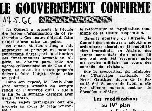 Enfin, à la veille du plan Simoun, un député de Batna dénonce également cette cinquième mesure de l'" opération Fouchet ". Le général Dominique Marie Renucci, choisit d'effectuer le rapport d'un télégramme d'un électeur, le 5 juin 17. Il affirme que cet appel anticipé va à l'encontre de l'article 3 du chapitre IX des accords d'Évian sur la protection des droits et des libertés des citoyens algériens de statut civil ou de droit commun qui signale que : " (…) les Algériens de statut civil de droit commun seront, pendant cinq ans, dispensés de service militaire ". Il insiste également sur les répercussions psychologiques que pourraient avoir l'envoi des appelés outre-mer 18. L'ordonnance a été dûment méditée et a été l'objet d'une étroite correspondance entre Christian Fouchet et le général Michel Fourquet. L'objectif était d'éviter des désertions et d'incorporer un grand nombre de jeunes FSE, d'Alger et d'Oran. À cette fin, le général Michel Fourquet a proposé à Christian Fouchet d'aligner les âges d'incorporation d'Algérie sur ceux de la métropole 19. C'est pourquoi, l'idée d'une mobilisation à l'âge de 19 ans a provoqué autant de remous. De fait, il existe un décalage entre les classes creuses en France, liées à une fécondité en chute et les classes trop importantes en Algérie, en vertu de la mobilisation des FSNA. Ils sont, donc, mobilisés à 20 ans en métropole, tandis qu'en Algérie, ils sont incorporés à l'âge de 21 ans.