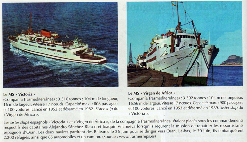 15 h 30. Tout le monde est déjà monté à bord, c'est-a-dire 2.200 passagers, 85 automobiles et un camion. Ainsi, avec une importante surcharge par navire, les quais sont désormais restés vides. Cependant, tout ne semble pas terminé. En effet, un officier des CRS et deux unités tentent de monter à bord du " Victoria ", mais le capitaine Sanchez Blasco, en haut de la passerelle, s'y oppose résolument : Ce navire tient lieu de territoire espagnol - affirme-t-il - et vous n'y avez aucune autorité - ajoute-t-il. La situation est tendue, et l'officier français demande alors des instructions par radio.