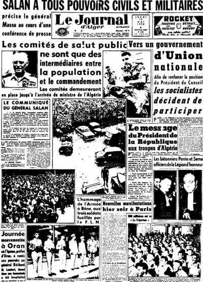 La préfecture d'ORAN fait de la résistance. Le préfet Lambert ayant demandé à Pflimlin de limiter le pouvoir de Salan au département d'Alger, et cette demande ayant été interceptée, la foule prend d'assaut la préfecture, évacue le préfet, et un comité de salut public sans militaires se met en place, et se rallie à Alger.