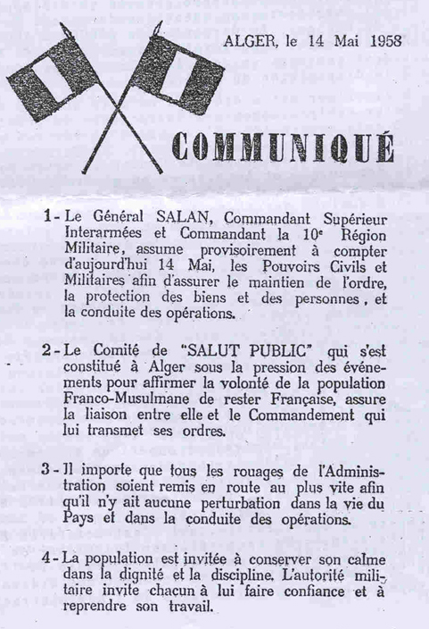 4h 00 : Le général MASSU donne lecture au balcon du GG du premier communiqué du CSP : " Le gouvernement d'abandon de Pierre PFLIMIN vient d'être investi avec la complicité des députés communistes... Jacques SOUSTELLE a été empêché de venir nous rejoindre. Le Comité de Salut Public supplie le Général De GAULLE de vouloir rompre le silence en vue de la constitution d'un gouvernement de salut public qui seul peut sauver l'Algérie de l'abandon "