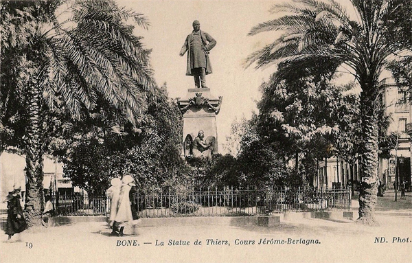 jardins, de statues et d'allées ombreuses. Dès cinq heures du soir, à la mode méridionale, tout Bône venait " faire le cours " la société d'un côté, le petit peuple de l'autre, jusqu'à la statue de Thiers. On ne savait pas la raison de cette présence, mais Thiers marquait la limite à ne pas dépasser aux jeunes amoureux si ce n'est en s'engageant pour toujours.
