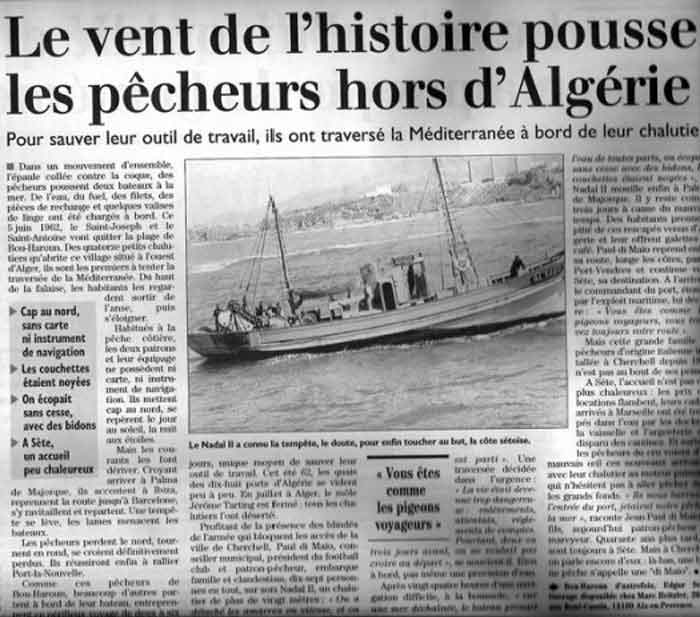 Comme ces pêcheurs de Bou-Haroun, beaucoup d'autres partent à bord de leur bateau, entreprennent ce périlleux voyage de deux à six jours, unique moyen de sauver leur outil de travail. Cet été 62, les quais des dix-huit ports d'Algérie se vident peu à peu. En juillet à Alger, le môle Jérôme Tarting est fermé : tous les chalutiers l'ont déserté. Profitant de la présence des blindés de l'armée qui bloquent les accès de la ville de Cherchell, Paul di Maïo, conseiller municipal, président du football club et patron-pêcheur, embarque famille et clandestins, dix-sept personnes en tout, sur son Nadal II, un chalutier de plus de vingt mètres : " On a détaché les amarres en vitesse, et on est parti ". Une traversée décidée dans l'urgence : " La vie était devenue trop dangereuse : enlèvements, attentats, règlements de comptes. Pourtant, deux ou trois jours avant, on ne voulait pas croire au départ ", se souvient-il. Rien à bord, pas même une provision d'eau. Après vingt-quatre heures d'une navigation difficile, à la boussole, " sur une mer déchaînée, le bateau prenait l'eau de toutes parts, on écopait sans cesse avec des bidons, les couchettes étaient noyées ", le Nadal II mouille enfin à Palma de Majorque. Il y reste coincé trois jours à cause du mauvais temps. Des habitants prennent pitié de ces rescapés venus d'Algérie et leur offrent galettes et café. Paul di Maïo reprend enfin sa route, longe les côtes, passe Port-Vendres et continue vers Sète, sa destination.