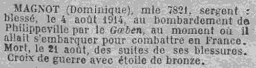 - MAGNOT Dominique, né le 7 septembre 1891 à Saoula (Département d'Alger, Algérie), décédé le 21 août 1914 des suites de ses blessures, Sergent, 3e Régiment de marche de zouaves, Matricule n° 7.821, classe 1911, n° 2.102 au recrutement d'Alger (" Extrait de l'acte de décès transmis à Berrouaghia, le 21 août 1914. ").