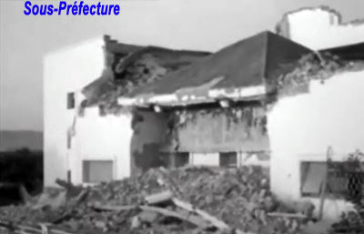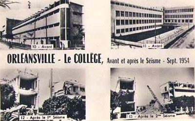 Mais, le 9 septembre 1954 (vingt ans après la destruction de Carnot, presque jour pour jour), se produisit le séisme qui devait détruire, en 12 secondes, les deux tiers de la capitale du Chéliff et de nombreux villages et douars environnants : a 1h05 toutes les horloges de la ville se sont arrêtées. La gare, l'église, le palais de justice installé depuis dans un wagon portait l'inscription à la peinture fraiche " Palais de justice ", l'Hôtel Beaudouin (un des meilleurs d'Algérie, comble cette nuit-la et où il n'y eut que deux rescapés), l'hôpital moderne qui devait être ouvert incessamment, la prison civile, un immeuble H.L.M. de neuf étages, non encore habité, heureusement, mais où treize ouvriers endormis furent ensevelis, la poste dont le receveur, sa femme et son petit-fils, furent miraculeusement sauvés, la mairie, dont le Maire, M. Biscambiglia, fit preuve de courage et de dévouement, s'écroulèrent comme châteaux de carte .... L'autre tiers devait être détruit par la secousse du 16 septembre, a 22h 20mn, en particulier la sous-préfecture s'effondrait, ensevelissant les archives et tout ce que possédait le sous-préfet, M. Debia. Mais il n'y eut pas de nouvelles victimes.