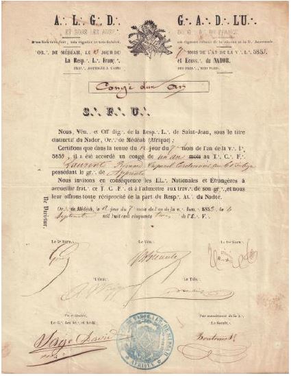 7 - Bélisaire, Soleil levant, pour Alger, l'Education sociale, Blida, Hippone, Bône, Cirta, Constantine, Les Trinosophes africains, Mostaganem, l''union africaine et la raison réunies (Oran), les Enfants de Mars, Philippeville, les Maçons réunis, Sidi-bel-Abbès, l'Union de Tlemcen.