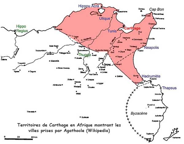 Agathocle (né en 361 av. J.-C. à Thermæ (ancienne Himère) et décédé en 289 av. J.-C. , ndlr), pressé en Sicile par les Carthaginois, trompa la vigilance de leur flotte, et débarqua en Afrique en 309 (Le 14 août 310 d'après Stéphane Gsell, "Histoire ancienne de l'Afrique du Nord, éd. Hachette, Paris, tome III, p. 24,ndlr), à El-Haouarieh, sur le côté oriental du golfe de Tunis, au sud du cap Bon. Les Siciliens firent des progrès rapides. Après avoir détruit l'armée carthaginoise, Agathocle dévasta les environs de la capitale, et reçut là soumission d'un grand nombre de places ; il marcha ensuite contre les villes maritimes, et en peu de temps, de gré ou de force, il en rangea plus de deux cents sous son obéissance. A la nouvelle de ces succès, les Libyens tributaires vinrent en grand nombre grossir le parti du vainqueur, et lui facilitèrent la conquête du littoral et les entreprises contre les populations de l'intérieur. Ces expéditions s'étendirent à l'ouest jusqu'à Hippone, (Bône) ; puis, elles atteignirent Stora et Collo. Une partie des Numides accepta l'alliance des Siciliens, le plus grand nombre attendit l'issue définitive de la lutte pour se prononcer. Mais Carthage sut tirer parti de cette hésitation, et dès que la fortune se montra plus favorable à ses armes, elle ramena les indigènes, recouvrit ses possessions, força Agathocle à s'enfuir secrètement, abandonnant son armée, qui évacua elle-même l'Afrique à la suite d'un traité. Cette invasion avait duré trois ans.