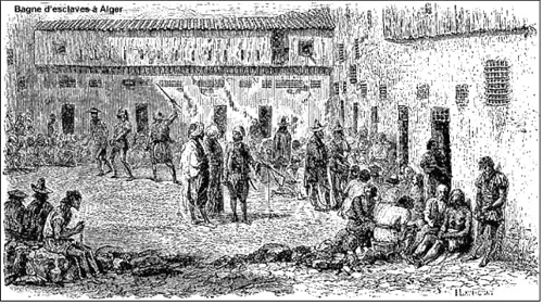 Les hommes capturés en mer fournissent le gros contingent des bagnes d'Alger, car le danger est partout en Méditerranée. Les bagnes algérois dans lesquels logent les esclaves sont propriété du souverain. Les esclaves se vendent au plus offrant au marché appelé " Batistan " ou " Badistan ". Les exactions sont insupportables dans le bagne aux cellules basses, sombres et malsaines, infestées de vermine. Couchés dans des hamacs pendus les uns au-dessus des autres, les esclaves souffrent du froid l'hiver, de la grande chaleur l'été, de l'humidité et de la vermine en toutes saisons, maltraités par des gardiens qui ne leur donnent que de mauvais biscuits et de l'eau souvent putride.
