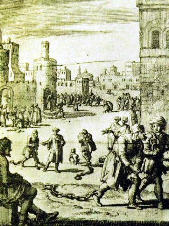 Certains maîtres mettaient leurs esclaves blancs au travail dans des fermes loin à l'intérieur des terres, où ils affrontaient encore un autre péril : la capture et un nouvel esclavage par des raids de Berbères. Ces infortunés ne verraient probablement plus jamais un autre Européen pendant le reste de leur courte vie. Le Prof. Davis remarque qu'il n'y avait aucun obstacle à la cruauté : " Il n'y avait pas de force équivalente pour protéger l'esclave de la violence de son maître : pas de lois locales contre la cruauté, pas d'opinion publique bienveillante, et rarement de pression efficace de la part des Etats étrangers ". Les esclaves n'étaient pas seulement des marchandises, ils étaient des infidèles, et méritaient toutes les souffrances qu'un maître leur infligeait. Le Prof. Davis note que " tous les esclaves qui vécurent dans les bagnos et qui survécurent pour écrire leurs expériences soulignèrent la cruauté et la violence endémiques pratiquées ici ". La punition favorite était la bastonnade, par lequel un homme était mis sur le dos et ses chevilles attachées et suspendu par la taille pour être battu longuement sur la plante des pieds. Un esclave pouvait recevoir jusqu'à 150 ou 200 coups, qui pouvaient le laisser estropié. La violence systématique transformait beaucoup d'hommes en automates. Les esclaves chrétiens étaient souvent si abondants et si bon marché qu'il n'y avait aucun intérêt à s'en occuper ; beaucoup de propriétaires les faisaient travailler jusqu'à la mort et achetaient des remplaçants. Le système d'esclavage n'était cependant pas entièrement sans humanité. Les esclaves recevaient habituellement congé le vendredi. De même, quand les hommes du bagno étaient au port, ils avaient une heure ou deux de temps libre chaque jour entre la fin du travail et avant que les portes du bagno ne soient fermées pour la nuit. Durant ce temps, les esclaves pouvaient travailler pour une paie, mais ils ne pouvaient pas garder tout l'argent qu'ils gagnaient. Même les esclaves du bagno étaient taxés d'une somme pour leurs logements sales et leur nourriture rance. Les esclaves publics contribuaient aussi à un fonds pour entretenir les prêtres du bagno. C'était une époque très religieuse, et même dans les plus horribles conditions, les hommes voulaient avoir une chance de se confesser et -- plus important -- de recevoir l'extrême-onction. Il y avait presque toujours un prêtre captif ou deux dans le bagno, mais pour qu'il reste disponible pour ses devoirs religieux, les autres esclaves devaient contribuer et racheter son temps au pacha. Certains esclaves de galères n'avaient donc plus rien pour acheter de la nourriture ou des vêtements, bien que durant certaines périodes des Européens libres vivant dans les villes barbaresques contribuaient aux frais d'entretien des prêtres des bagnos. Pour quelques-uns, l'esclavage devenait plus que supportable. Certains métiers -- en particulier celui de constructeur de navire -- étaient si recherchés qu'un propriétaire pouvait récompenser son esclave avec une villa privée et des maîtresses. Même quelques résidents du bagno réussirent à exploiter l'hypocrisie de la société islamique et à améliorer leur condition. La loi interdisait strictement aux musulmans de faire le commerce de l'alcool, mais était plus indulgente avec les musulmans qui le consommaient seulement. Des esclaves entreprenants établirent des tavernes dans les bagnos et certains eurent la belle vie en servant les buveurs musulmans. Une manière d'alléger le poids de l'esclavage était de "prendre le turban" et de se convertir à l'islam. Cela exemptait un homme du service dans les galères, des ouvrages pénibles, et de quelques autres brimades indignes d'un fils du Prophète, mais ne le faisait pas sortir de la condition d'esclave. L'un des travaux des prêtres des bagnos était d'empêcher les hommes désespérés de se convertir, mais la plupart des esclaves semblent ne pas avoir eu besoin de conseil religieux. Les chrétiens pensaient que la conversion mettrait leur âme en danger, et elle signifiait aussi le déplaisant rituel de la circoncision adulte. Beaucoup d'esclaves semblent avoir enduré les horreurs de l'esclavage en les considérant comme une punition pour leurs péchés et comme une épreuve pour leur foi. Les maîtres décourageaient les conversions parce qu'elles limitaient le recours aux mauvais traitements et abaissaient la valeur de revente d'un esclave. Rançon et rachat Pour les esclaves, l'évasion était impossible. Ils étaient trop loin de chez eux, étaient souvent enchaînés, et pouvaient être immédiatement identifiés par leurs traits européens. Le seul espoir était la rançon. Parfois, la chance venait rapidement. Si un groupe de pirates avait déjà capturé tant d'hommes qu'il n'avait plus assez d'espace sous le pont, il pouvait faire un raid sur une ville et ensuite revenir quelques jours plus tard pour revendre les captifs à leurs familles. C'était généralement à un prix bien plus faible que celui du rançonnement de quelqu'un à partir de l'Afrique du Nord, mais c'était encore bien plus que des paysans pouvaient se le permettre. Les fermiers n'avaient généralement pas d'argent liquide, et pas de biens à part la maison et la terre. Un marchand était généralement prêt à les acquérir pour un prix modique, mais cela signifiait qu'un captif revenait dans une famille qui était complètement ruinée. La plupart des esclaves ne rachetaient leur retour qu'après être passés par l'épreuve du passage en pays barbaresque et de la vente à un spéculateur. Les riches captifs pouvaient généralement trouver une rançon suffisante, mais la plupart des esclaves ne le pouvaient pas. Les paysans illettrés ne pouvaient pas écrire à la maison et même s'ils le faisaient, il n'y avait pas d'argent pour une rançon. La majorité des esclaves dépendait donc de l'œuvre c