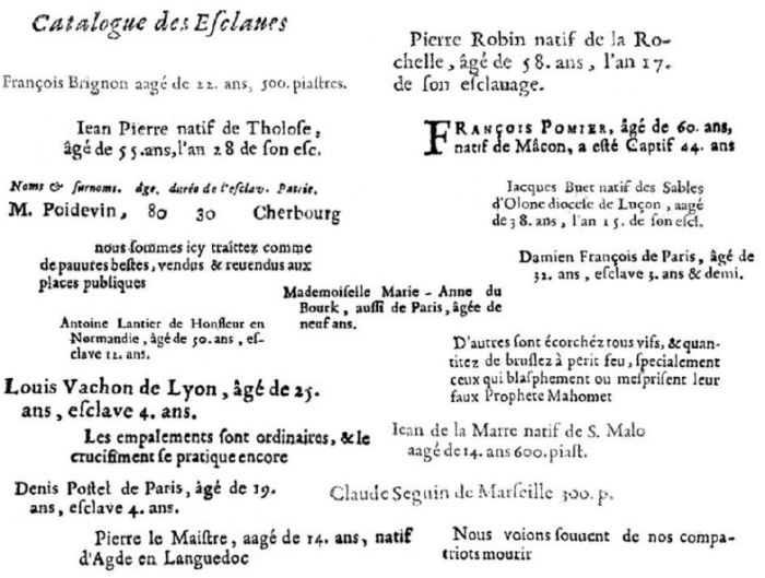 Extraits de documents des 17 et 18 siècles: listes d’esclaves rachetés et témoignages. |