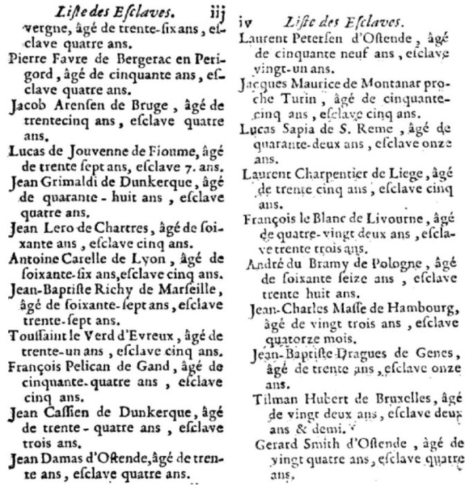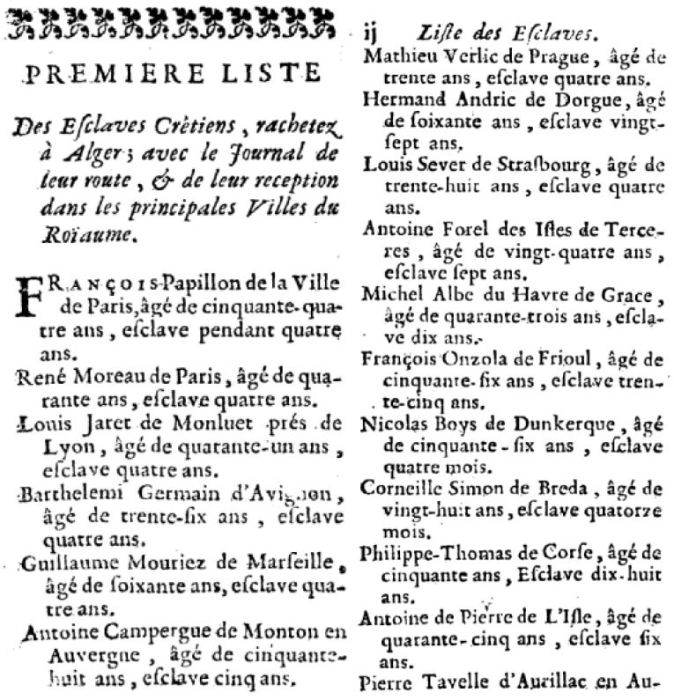 Liste d’esclaves français rachetés en 1720 à Alger et à Tunis par l’Ordre de la Sainte Trinité (Extraits). | |