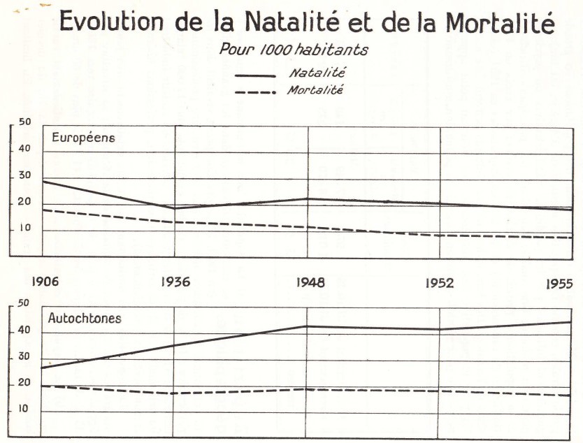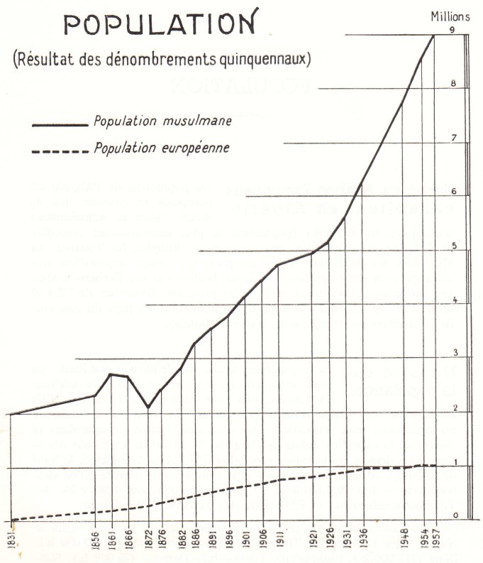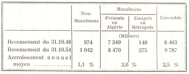 La situation démographique, problème fondamental de l'Algérie, conditionne toute la politique économique et sociale. Peuplé de 2 500 000 habitants en 1856, ce territoire comptait au 1er janvier 1957, dix millions d'habitants (militaires exclus), dont un million de non-Musulmans (tous civils) et neuf millions de Musulmans. La population algérienne a donc quadruplé en cent ans ; alors qu'elle représente moins de 3 p. mille de la population mondiale, elle s'accroît annuellement dans une proportion qui est de 1% de l'accroissement de la population mondiale. Cette cadence déjà rapide s'est accélérée considérablement au cours des dernières années. En l'absence de mouvements migratoires importants, l'accroissement annuel de la population est dû à l'excédent des naissances sur les décès qui s'est établi à 265000 en 1956, soit en valeur relative 2,65 %. Ce taux est un des plus forts du monde.