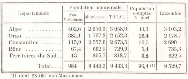1300000 âmes plus en six ans. Dans la structure administrative actuelle, la population de l'Algérie (travailleurs en Métropole compris) s'établissait ainsi au 31 octobre 1951, date du dernier recensement général : Un recensement n'est qu'une mesure dont il convient d'examiner la précision.