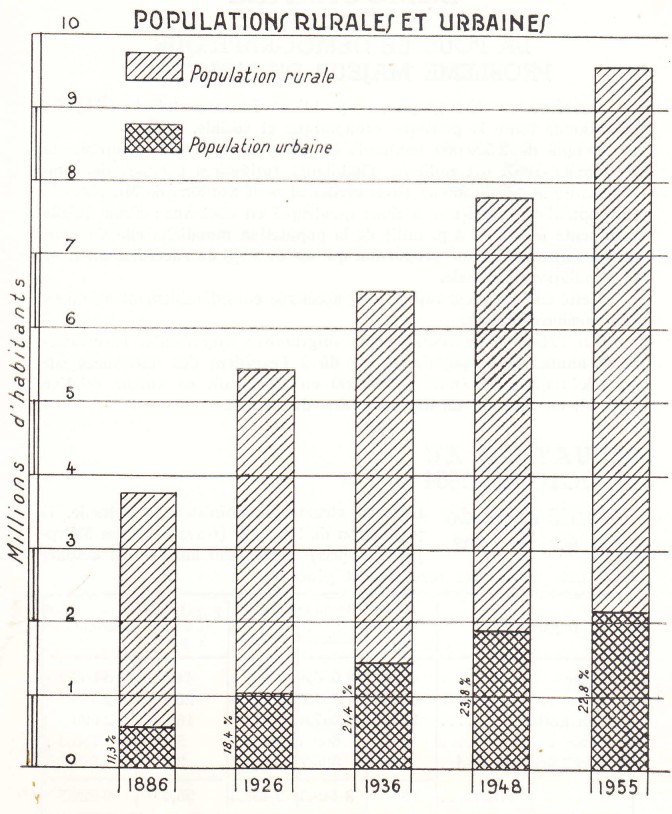 a) La population non musulmane a tendance à se concentrer davantage dans les grandes villes (en 1954, 77 % des Européens vivaient dans les 46 communes de caractère urbain) d'où une structure professionnelle particulière : 1,6 % de primaires (25 000 exploitants plus 17 000 salariés environ) ; 34 % de secondaires (cadres et ouvriers du secteur industriel ou artisanal) ; 50 % de tertiaires (fonctionnaires, professions libérales et commerciales essentiellement). La population non musulmane est encore relativement très jeune, malgré les effets rapides de la baisse de la fécondité : sa structure par âge actuelle se compare à celle de la population française vers 1866 : 35 % de moins de 20 ans ; 54 % d'adultes ; 11 % de plus de 60 ans. b) La population musulmane reste encore essentiellement rurale en dépit de l'augmentation rapide, surtout depuis la fin du dernier conflit, de la population des grandes communes urbaines. En limitant la comparaison aux deux derniers recensements, on donnera la répartition par grandes catégories de communes (nombres corrigés).