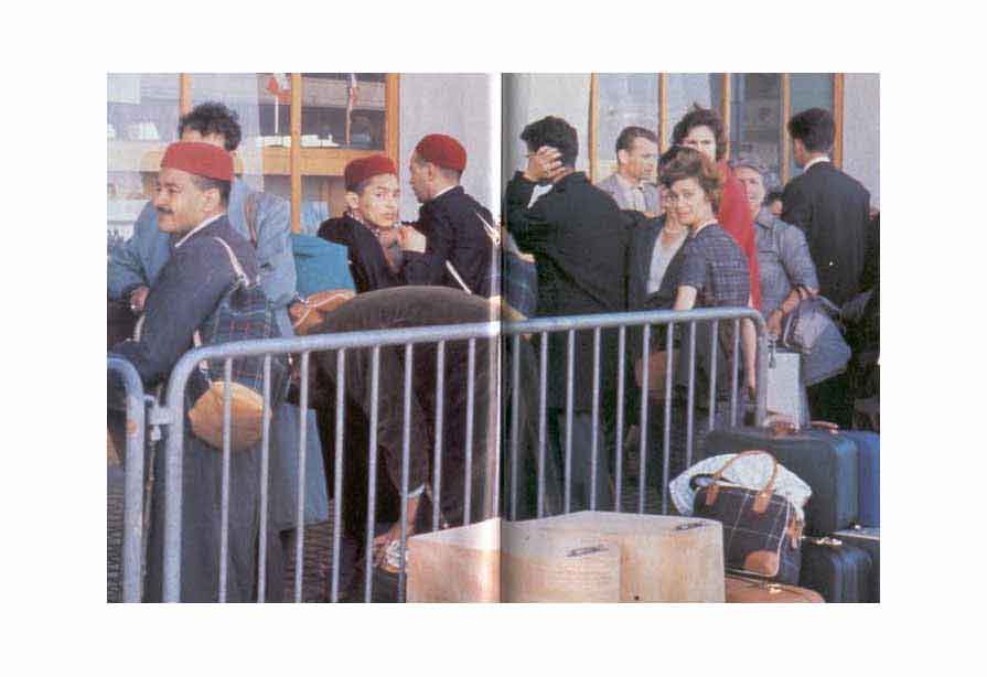 Dans l'aérogare de Maison-Blanche, c'est le caravansérail. Il est difficile de traverser le hall tant les groupes sont serrés les uns contre les autres. Près d'un millier d'hommes, de femmes, d'enfants attendent anxieux, angoissés. L'atmosphère est lourde de fumée, d'odeur de transpiration, de victuailles aussi. Certaines familles campent ici depuis plusieurs jours sans pouvoir quitter l'aéroport faute d'avions assez nombreux. Les hommes font queue, interminablement, devant des guichets qui n'ouvrent que par intermittence.