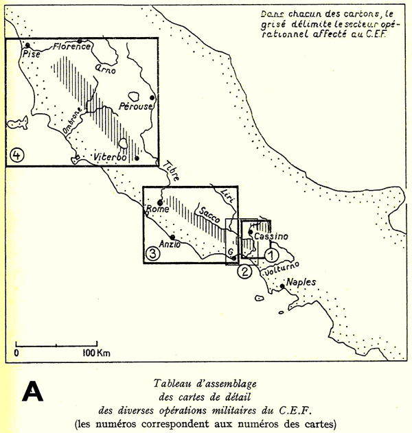 Ces dernières années, nous avons vu partir beaucoup de nos anciens combattants de 1939-1945. Ils avaient été très marqués par la campagne d'Italie et quand on parle avec les survivants, c'est ce souvenir qui reste le plus vivace. C'est cette campagne que nous vous proposons de mieux connaître, dans son déroulement mais surtout dans son contexte politico-militaire assez étonnant! 25 novembre 1943 sur l'aéroport de Naples: Alors que les derniers éléments de la 2ème Division d'Infanterie Marocaine en provenance de Bizerte et d'Oran n'ont pas encore tous débarqué à Naples, un C-47 "Dakota" de l'US Air Force y dépose le Général Juin et une partie de son état-major. Le temps est exécrable. Chez les Alliés, personne ne s'est déplacé pour accueillir le chef du Corps Expéditionnaire Français, pourtant général d'Armée à cinq étoiles... Entre ces deux scènes il y a eu la fin de la bataille d'Italie, la participation décisive du CEF, l'épopée de Juin et de ses troupes et au final la véritable résurrection de l'armée française. Cette campagne fut et demeure injustement méconnue des Français et c'est avec raison et amertume que le correspondant de guerre Pierre Ichac écrivait en 1946 : "Et les morts d'Italie me demandent pourquoi la France les a oubliés"… En prélude à la campagne d'Italie continentale, il y a eu la Sicile et la Corse. En Sicile, le 10 juillet 1943 débarquent la VII°Armée US de Patton, la VIII° Armée Britannique de Montgomery et… un bataillon de Goumiers! (le 4ème Tabor du 2°GTM) En effet, Patton qui a apprécié cette troupe en Tunisie en 42-43, a demandé à en avoir un élément pour la Sicile dont la conquête est terminée le 17 août. En Corse, du 13 septembre au 4 octobre, à l'initiative de Giraud et contre l'avis des Alliés, il y a eu le débarquement et la reprise de l'île (ce qui pourrait faire l'objet d'un article séparé) Début septembre 43, aux ordres du général Alexander, les VIII° Armée Britannique (à droite) et V°Armée US (à gauche) débarquent dans le sud de l'Italie continentale. Les combats sont tout de suite acharnés face à une armée allemande entraînée et mordante. L'avance est lente et dès l'automne les Alliés sont bloqués devant la "Ligne Gustav", la quatrième des neuf lignes de défense allemandes aménagées en profondeur tout au long de la botte italienne. Entre Naples et Rome, la Ligne Gustav traverse l'Italie d'une mer à l'autre, s'appuyant sur un relief très difficile à conquérir, et passe par Cassino et au dessus de cette localité le fameux Monte Cassino qui donnera son nom à la bataille. En effet, il est fréquent de parler de Cassino à propos du CEF. En fait, c'est une image, car aucune unité française n'a combattu à Cassino, ni au village qui porte ce nom dans la vallée, ni sur le mont Cassin, ces lieux se trouvant en secteur britannique. En réalité les troupes françaises ont combattu d'abord au nord de Cassino pendant la bataille d'hiver 43-44 puis au sud de Cassino pendant l'offensive du Garigliano, certes dans le cadre de la bataille dite de Cassino. L'action du CEF a connu schématiquement trois phases bien distinctes dans leur style et dans leur lieu d'application (voir carte A) :
