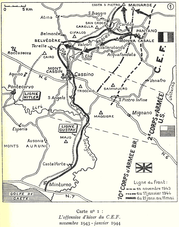 L'arrivée du CEF se caractérise par un manque de confiance manifeste des Alliés en dépit de la conduite des troupes françaises en Tunisie de novembre 42 à mai 43, lesquelles avaient combattu durement et avec des moyens de misère à l'époque (c'était avant le rééquipement en matériels américains) Les autorités alliées n'ont retenu que le désastre de 1940 et considèrent au début le CEF comme une troupe d'appoint au sein de la V°Armée US du général Clark. C'est la 2ème DIM qui reçoit mi-décembre la première mission confiée aux Français en relève d'une division américaine durement étrillée: la prise du Pantano, un massif enneigé qui culmine à 1100 mètres, au nord-est de Cassino. Malgré la résistance ennemie, un terrain et des conditions météo très durs, les RTM enlèvent la position. Débarquée à Naples à partir du 23 novembre, la 2°DIM du Général Dody est la première Division française à entrer dans la campagne d'Italie avec le 4ème GTM et sera (avec la 4ème DMM) la dernière à en sortir 9 mois plus tard. Son effectif est de 14000 à presque 16000, selon les renforcements alloués, dont 41 à 47% d'européens selon les périodes. C'est une division d'infanterie semi-motorisée, avec 3 régiments d'infanterie, les 4ème RTM (Taza), 5ème RTM (Oujda) et 8ème RTM (Meknes), un Régiment blindé de chars légers, d'automitrailleuses et de scout-cars, le 3ème RSM (Meknes), un régiment d'artillerie, le 63ème RAA (Fez), un bataillon de génie (87ème BG), un bataillon de DCA (41ème GFTA) et des éléments divisionnaires de commandement, transmissions, soutien logistique et santé. Depuis septembre 43, elle s'entraînait dans la région de Lourmel, Bou-Tletis, Rio-Salado, Hammam-Bou-Hadjar. Elle est la seule division engagée en attendant l'arrivée de la suivante, la 3ème DIA fin décembre. C'est grâce à elle et à ses premiers succès dans le terrible hiver des Abruzzes que les Alliés reprendront confiance dans les troupes françaises, et c'est elle qui effacera dans leur esprit le souvenir de la défaite de 1940. Puis chaque nouvelle division française qui entrera en ligne ultérieurement apportera sa part à ce rétablissement de confiance dans nos Armes. C'est là toute la gloire des combattants de l'Armée d'Afrique en Italie que d'avoir redoré le blason de la France auprès des Alliés! La 2ème DIM conquiert successivement des massifs dont les noms restent dans l'histoire de cette unité (cf. carte 1): San Michele, Pantano, La Mainarde en décembre, puis Mona Casale, San Croce en janvier 44. Début janvier c'est l'entrée en ligne de la 3ème DIA du général de Monsabert (ainsi que du 3ème GTM) Elle prend place dans le dispositif au sud de la 2ème DIM, relevant une division américaine. La DIA a été constituée à partir de la Division de Marche de Constantine après la bataille de Tunisie. Son numéro rappelle la III ème Légion Augusta des Romains dont elle est considérée comme l'héritière. Son insigne aux trois croissants bleu-blanc-rouge comporte la Victoire de Cirta, statuette romaine trouvée dans des fouilles et reproduite également au sommet du monument aux morts de Constantine (la Cirta des Romains) cher au cœur du général Juin (après guerre, il s'y recueillait souvent. C'était, disait-il sa "Colline de Sion"). Elle est organisée comme la 2ème DIM, avec le même effectif et la même proportion d'européens. Elle comprend les 3ème RTA (Bône), 7ème RTA (Sétif), 4ème RTT (Tunisie), 3ème RSA (Batna), 67ème RAA (Constantine), 83ème BG (Alain Mimoun…), 37ème GFTA, ses éléments divisionnaires, et renforcée pour l'Italie par les 7ème RCA et 64ème RAA. Elle s'empare elle aussi de massifs escarpés et bien défendus: Monna Casale et le Belvédère en janvier. Pendant cette phase de combat dans les Abruzzes, et compte tenu du terrain, ce fut essentiellement une guerre de fantassins appuyés au plus près par les artilleurs. Les pertes sont lourdes et la proportion de cadres donne une idée des pertes totales et de la dureté des combats: c'est ainsi que les 12 et 13 janvier 1944, un bataillon du 8°RTM (2ème DIM) a perdu 9 officiers sur 12 (tués et blessés) Le 25 janvier c'est le nom de "Belvédère" qui entre dans l'histoire de la 3ème DIA. Le 4ème RTT a des pertes terrifiantes en attaquant cette position solidement tenue, dans un terrain épouvantable, face à un ennemi coriace retranché dans des positions défensives très bien aménagées et minées. Le bilan est lourd et, contrairement à une légende malveillante qui prétend "qu'on envoyait les Indigènes au massacre", il montre là encore un taux de pertes très élevé parmi les cadres: le Colonel a été tué ainsi que 13 autres officiers et certaines compagnies ont terminé le combat sans aucun officier vivant, ne restant parfois qu'un sous officier Indigène.