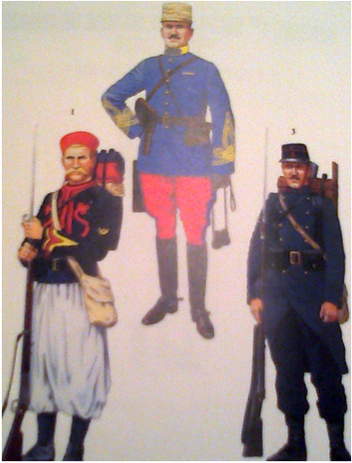Voici quelques uniformes arborés en 1914 par les troupes venues d'Afrique : 1. Zouave du 1er Régiment de marche (sergent), 2. Capitaine de tirailleurs, 3. 1er régiment d'infanterie coloniale. Source : French colonial and African troops, Osprey publishing, 1996. Ces tenues brillantes n'allaient pas résister longtemps. Rappelons que, de toutes manières, ces couleurs passaient vite sous l'effet du soleil, de la poussière et de la boue. Après quelques heures de combat, la poudre et la terre se chargeaient de rendre ces hommes méconnaissables.