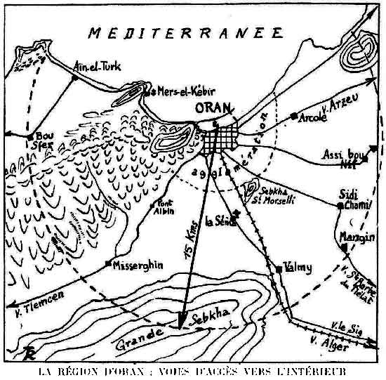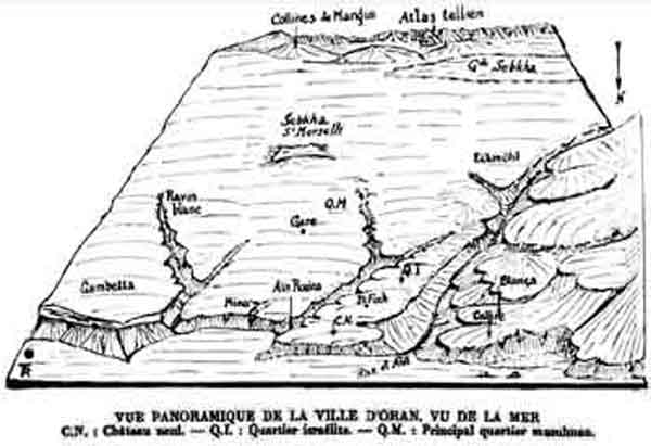 Au fond d'une baie semi-circulaire, se développant de la pointe de Mers-el-Kébir à celle de l'Aiguille, se rencontrent : la mer, la montagne, des ravins, des plateaux étages. 150 kilomètres de mer séparent Oran des côtes espagnoles les plus proches, de Carthagène.