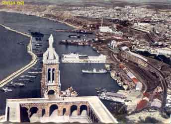 raies des artères rayonnantes, les courbes des boulevards circulaires, les taches des faubourgs, les forteresses espagnoles et turques, les minarets des mosquées, les clochers et dômes des églises, le tout dominant les bassins du port.