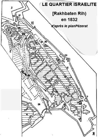 construites, offrent une cour intérieure entourée de portiques aux arcs outre-passés. Le nouveau quartier juif est bâti à la mauresque avec ruelles étroites et irrégulières, impasses finissant en culs-de-sacs. La cité se compose de trois agglomérations distinctes : la Ville Basse la Blança, la Ville Haute et la Marine. La seconde est entourée d'une enceinte dominant à l'ouest le ravin Ras-el-Aïn, à l'est l'Ain Rouina. Peuplée de Juifs, elle comprend le quartier des boulangers, des bouchers, des bijoutiers et des orfèvres, encombrés d'échoppes et de masures. La spécialisation des quartiers, selon les métiers, rappelle la disposition des villes européennes au Moyen Age et de la Casbah d'Alger. Il y a des tisserands, des tanneurs, des babouchiers arabes.