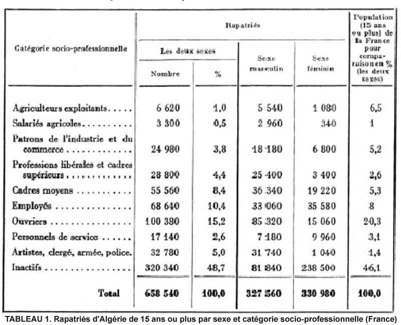 Les nombreux tableaux dressés à l'occasion du recensement de 1968 pour les rapatriés fournissent une abondante documentation pour répondre à toutes les questions qu'on se pose. A titre d'exemple, on trouvera dans cet article, la carte donnant la proportion des rapatriés d'Algérie dans la population de chaque département et un tableau donnant la répartition des rapatriés par catégorie socio-professionnelle et la comparaison avec la population totale de la France (carte I et tableau 1).
