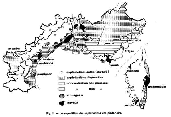Au niveau de la petite région agricole la répartition apparaît plus inégale encore fig1. Aux zones vides et aux bastions isolés s'opposent des zones d'occupation plus dense, des " nuages " et enfin des noyaux où les domaines deviennent contigus Ainsi les rapatriés ont-ils tendance à fuir les régions