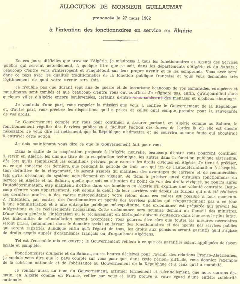 Je n'oublie pas que durant sept ans de guerre et de terrorisme beaucoup de vos camarades, européens et musulmans, sont tombés et que beaucoup d'entre vous ont souffert. Je n'ignore pas, enfin,qu'aujourd'hui dans quelques villes d'Algérie encore bouleversées, certains d'entre vous subissent des menaces et d'odieux chantages. Je voudrais d'une part, vous rappeler la mission que vous a confiée le Gouvernement de la République et, d'autre part, vous précisez les dispositions qu'il a prises et celles qu'il compte prendre pour la sauvegarde de vos droits.