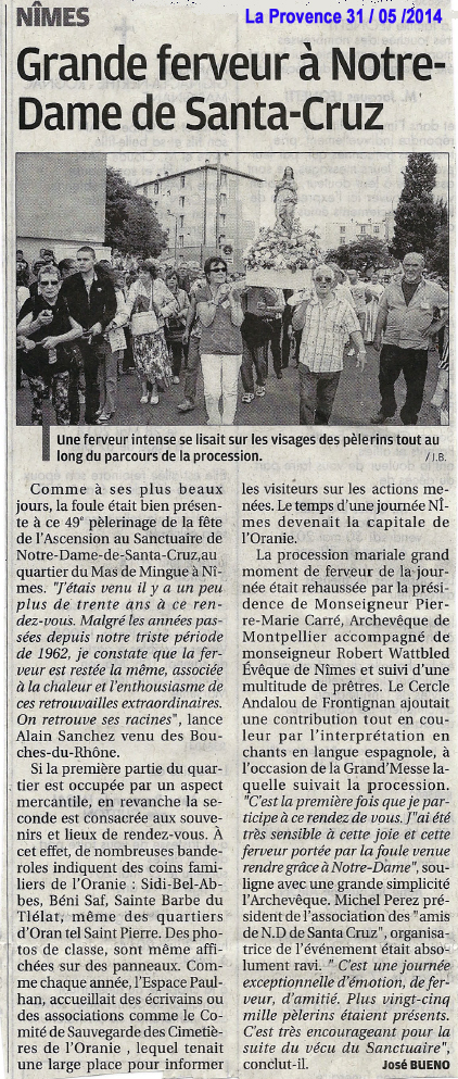 Il y avait aussi, le matin, une radio et TV pieds-noirs et harkis, qui se plaint de n’être pas assez soutenue par la communauté, et des chanteurs. La procession, de l’église au sanctuaire, a débuté à 14 h 30 précises, une marée humaine récitant le Notre Père et le Je vous salue Marie, l’archevêque de Montpellier et sa crosse, le sanctuaire déjà envahi pour l’office de plein air avant même que n’y parvienne le cortège accompagnant la vierge chérie hissée sur un lit de fleurs, les gens se levant et s’inclinant sur son passage, les cloches à toutes volées à son arrivée, puis la chorale andalouse en costume interprétant un thème un peu nostalgique le temps que tous prennent place pour rendre grâce. PHILIPPE BERJAUD 30/05/2014, 12 h 00 http://www.midilibre.fr/2014/05/30/santa-cruz-la-maman-des-pieds-noirs-d-oranie,867809.php#