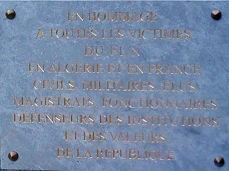 Le total des victimes du FLN serait proche des 120 à 130 000 (militaires, civils et Harkis) Parmi ces victimes, des femmes, des hommes, des enfants, des militaires, des magistrats, des fonctionnaires, des gardes champêtres, des français et des algériens, parmi lesquels 76 enseignants dont le plus " célèbre " est Guy MONNEROT, assassiné à Tifefel (Aurès) le 1er novembre 1954
