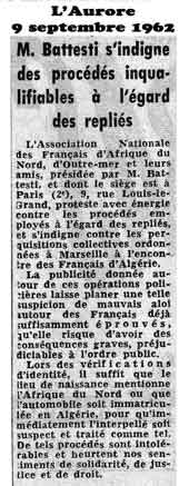 L'Association Nationale des Français d'Afrique du Nord, d'Outre-mer et leurs amis, présidée par M. Battesti, et dont le siège est à Paris (2e), 9, rue Louis-le-Grand, proteste avec énergie contre les procédés employés à l'égard des repliés, et s'indigne contre les perquisitions collectives ordonnées à Marseille à l'encontre des Français d'Algérie.