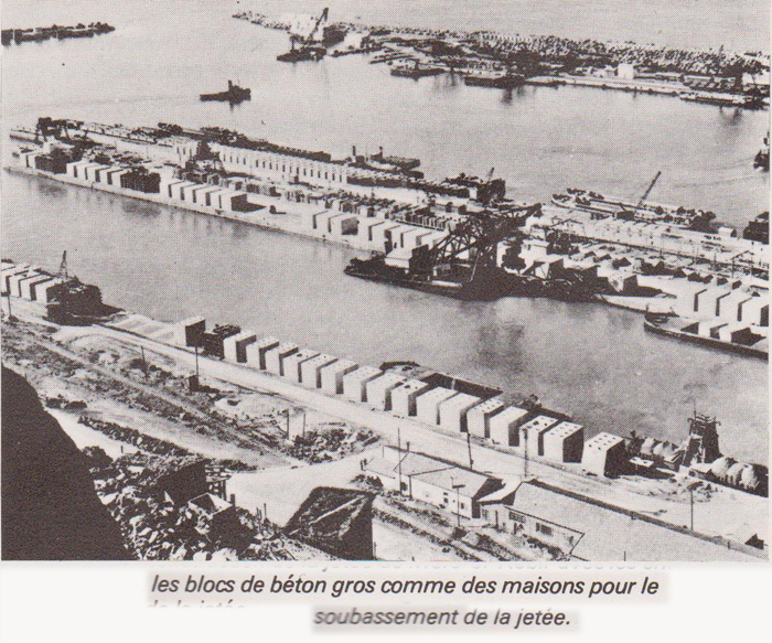 D'abord un port. Un port défendu contre la mer par deux jetées, longues au total de plusieurs kilomètres, fondées a 30 mètres de profondeur. Un port qui comportera dans sa partie nord une zone