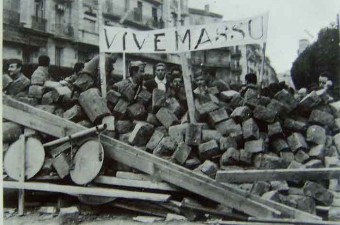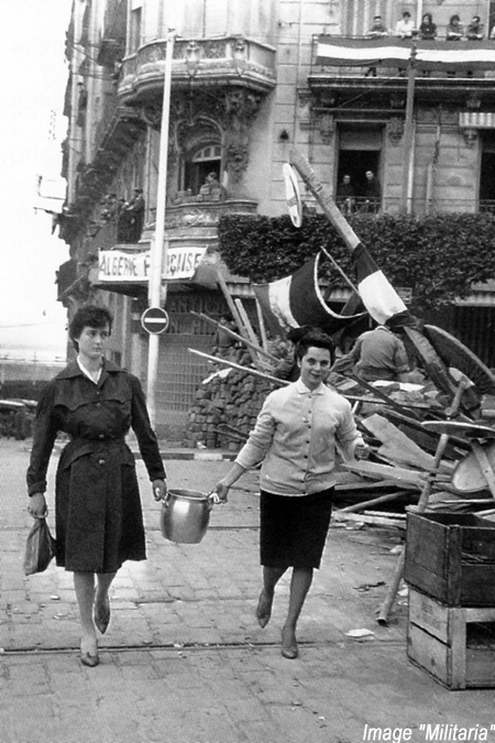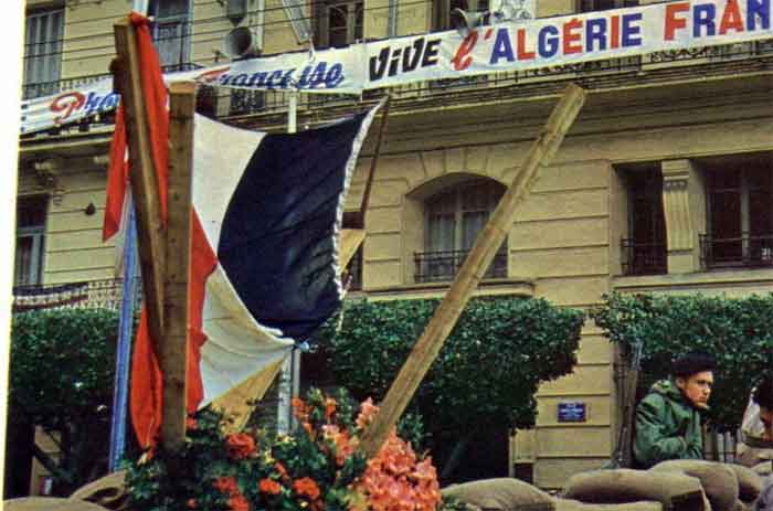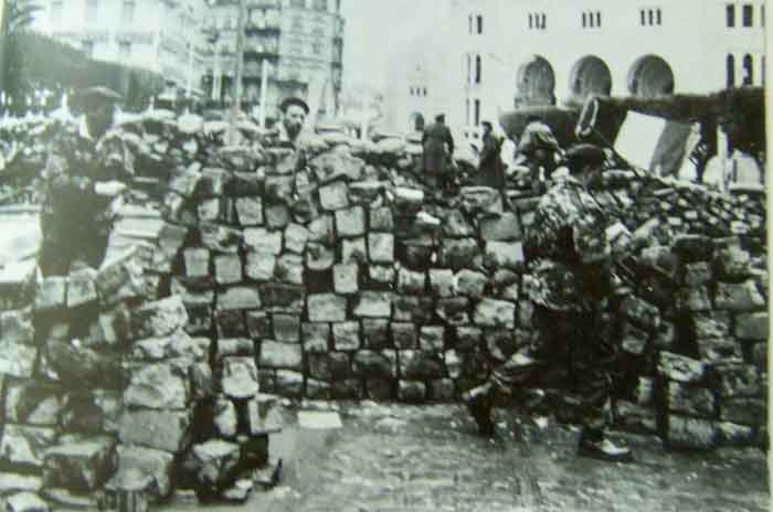 24 janvier 1960, 19 h 53 : le général Challe décrète l'état de siège et annonce qu'il fait converger des régiments de l'intérieur sur Alger. Beaucoup d'Algérois, bravant l'interdiction de rassemblement de plus de trois personnes, rejoignent le réduit des facultés, " le PC Lagaillarde " ou le camp retranché de la Compagnie algérienne, " le PC Ortiz ". Le député Lagaillarde et le cafetier du Forum Joseph Ortiz, le chef du Front National Français sont les leaders de cette entreprise patriotique, avec Auguste Arnould. l'animateur du Comité d'Entente des Anciens combattants, le Dr Pérez, adjoint d'Ortiz, et Jean-Jacques Susini, président de l'Association générale des Etudiants d'Alger, qui répond ainsi au général Challe : " Nous jurons sur l'honneur que les manifestants n'ont pas tiré les premiers. Nous n'avons jamais combattu les fils de France. Notre décision est toutefois prise. Nous tiendrons jusqu'au bout." La " semaine des barricades " commence, tandis qu'à 2 h 30 du matin le général de Gaulle dénonce ce " mauvais coup porté à la France ". Ce lundi 25 janvier, population et parachutistes fraternisent avec les émeutiers. Au PC Lagaillarde règne une atmosphère militaire, avec le salut aux couleurs et la garde au drapeau taché de sang qui porte la croix de la Valeur militaire d'un UT. Le premier ministre Debré, arrivé à Alger, constate avec inquiétude " l'osmose " insurgés-militaires.