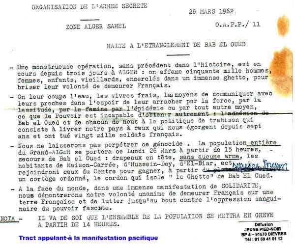"Des soldats de l'armée française aujourd'hui ouvrirent le feu à l'arme automatique sur 5000 européens et européennes qui marchaient dans Alger en brandissant des drapeaux tricolores et en chantant la Marseillaise.