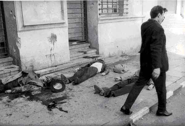 Durant 15 minutes les troupes maintinrent le feu. Elles tuèrent 35 personnes et beaucoup des 130 blessés mourront avant demain. Nous étions protégés des balles par le mur humain de la foule qui nous entourait.