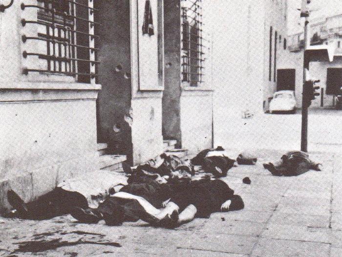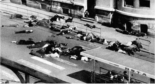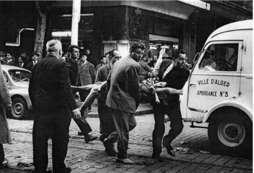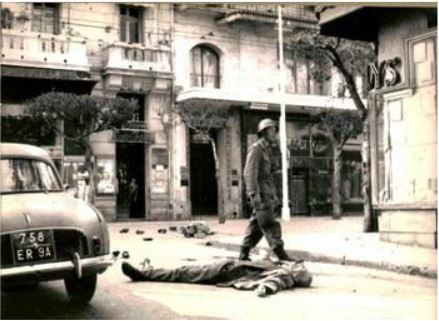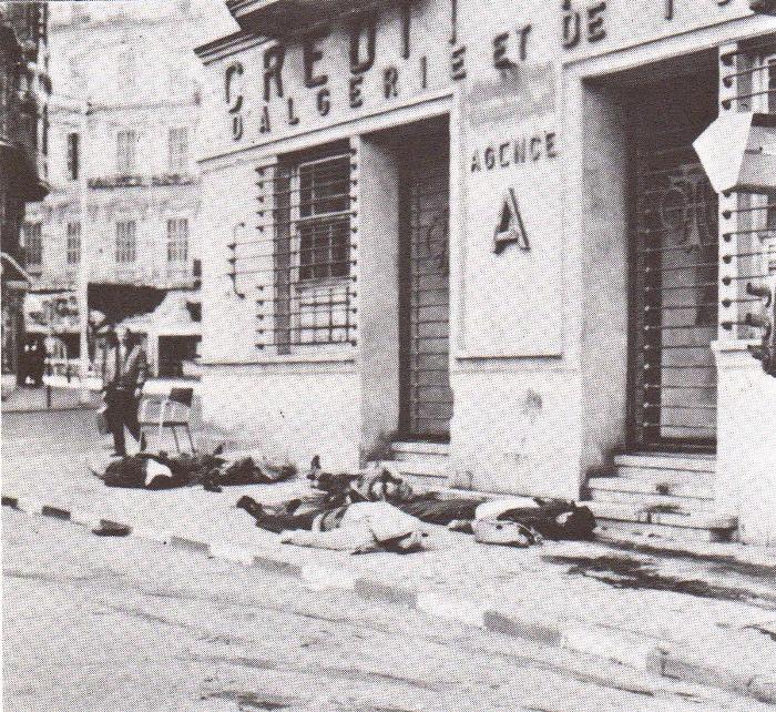 Ca et là des corps sanguinolents s'amoncelaient. Des flaques de sang recouvraient l'asphalte et commençaient à courir le long des caniveaux. Chaque européen était devenu proie, gibier. La tempête de fer et de feu faisait rage. Les armes de tous calibres semaient la mort avec une joie féroce, dirigée par des Français sur d'autres Français. Des hommes qui, déjà, se portaient au secours des victimes étaient touchés à leur tour. Au fracas des armes se confondaient les hurlements de peur et de douleur, les plaintes, les râles et les prières de ceux qui demandaient pitié. Mais de pitié il n'y en avait aucune chez ces monstres là. C'était un spectacle horrible, inhumain. Dans le tumulte des détonations, on percevait d'autres cris de détresse :