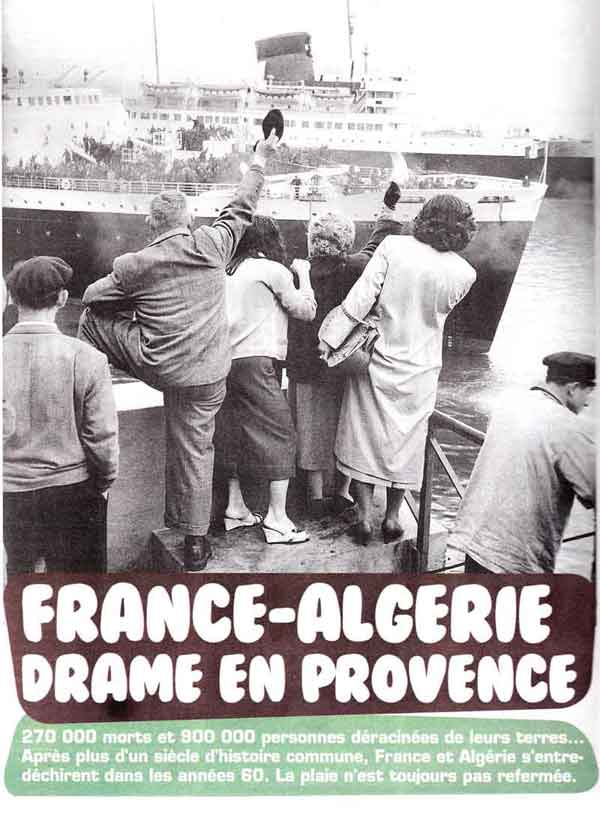 En 1830, les troupes françaises prennent Alger. C'est le début de la colonisation de ce vaste territoire outre-Méditerranée. Jusqu'à la fin des années 1950, la France y développe les villages et les villes, les écoles, les infrastructures routières et ferroviaires, le réseau sanitaire, l'économie et les banques, les activités industrielles et agricoles. La cohabitation entre Européens (Français, mais aussi Espagnols, Portugais, Italiens, etc) et autochtones s'installe clans l'insouciance. Le XXe siècle va mettre un terme à cette douceur de vivre. (1) Au fil des décennies, le fossé se creuse entre autochtones (2) et Européens.