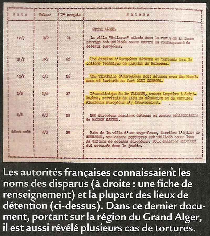 12 juillet 1962, la gendarmerie d'Harrach rédige une note indiquant clairement que des " interrogatoires au moyen de la torture sont menés par le lieutenant Saïd, qui appartient à la " Commission mixte ", créée dans le cadre des accords d'Evian pour " gérer " la transition ! Le 22 janvier 1963, le général de Brebisson avertit l'ambassadeur de France en Algérie de " brutalités exercées contre les Français arrêtés par la police algérienne ". Il joint a sa correspondance plusieurs dizaines de témoignages. En vain. Selon les documents, " aucune des plaintes déposées après juillet 1962 par des Européens à l'encontre de musulmans pour des occupations d'appartements, vols, pillages, viols, enlèvements et meurtres n'ont eu de suivi, quand bien même les auteurs de ces crimes étaient identifiés ". C'est notamment le cas de " deux tortionnaires identifiés d'un certain Giuseppe Vaiasicca soumis a l'électricité le 19 septembre 1962 " ; deux inspecteurs de la sécurité algérienne faisant office de gardes du corps d'Ahmed ben Bella, nouveau président du gouvernement algérien !