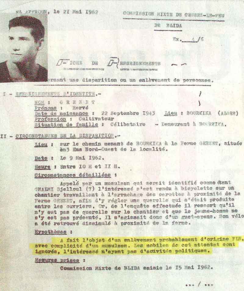 Le premier document retrouvé concernant les " enlèvements " perpétrés par le FLN date du 15 décembre 1957. Intitulée " Note au sujet des personnes enlevées par les rebelles algériens ", elle émane de l'état-major mixte et est remise " de la main à la main ", est-il précisé, au colonel Magnv. Le but recherche par les ravisseurs y est ainsi résumé : " affermir par la terreur l'emprise du FLN ".