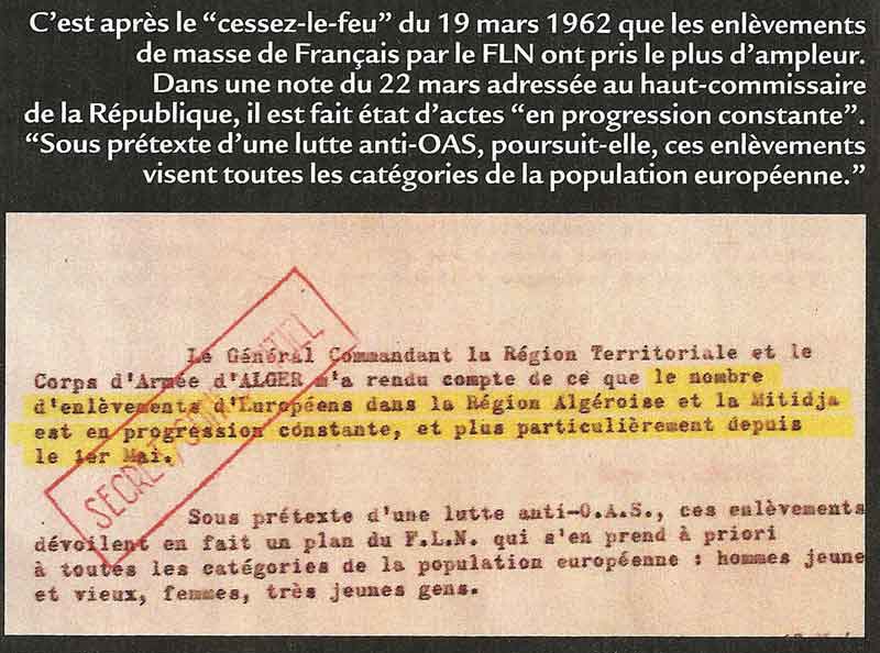 Des dizaines de documents en témoignent : les autorités françaises savent avec précision où se trouvent les principaux lieux de séquestration, mais n'interviennent presque jamais : " Nous sommes impuissants, nous n'y pouvons rien, nous avons reçu l'ordre de les laisser faire ", regrette un militaire dans une note. La vague d'enlèvements - plusieurs dizaines de milliers au total - atteint son point culminant après le "cessez-le-feu" et l'indépendance ; " en deux mois et demi, du 19 mars à la fin mai 1962, écrit Jordi, il y a eu plus d'enlevés et de disparus qu'entre novembre 1954 et le 18 mars 1962. " A partir d'avril, " les enlèvements d'Européens par le FLN sont quasi systématiques ", ajoute un rapport. Extraits d'une directive interne du FLN saisie par le renseignement militaire : " désormais, les enlèvements ne seront plus effectués sur des individus mais sur des familles entières ". Il reste aujourd'hui près de 4 OOO disparus dont les corps n'ont jamais été retrouvés.