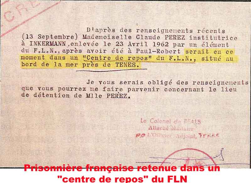 " D'après des renseignements récents [13 septembre], mademoiselle Claude Perez, institutrice ai Inkermann, enlevée le 23 avril 1962 par le FLN [. . .] est en ce moment dans un " centre de repos " du FLN situé au bord de la mer près de Ténès. Elle est détenue là avec deux autres captives enlevées a Dilian et à Orléansville. " L'auteur cite aussi le cas de " Mme Valadier enlevée à Alger le 14juin 1962 par le FLN et retenue dans une maison close de la basse casbah. " Parvenue à s'enfuir et à rentrer en France, elle sera hospitalisée en neurologie à Nîmes en 1963. Son témoignage, cité à l'époque par plusieurs associations de rapatriés, ne sera jamais reconnu par la France. Il était pourtant vrai !