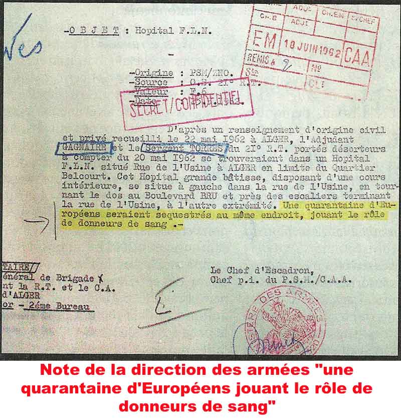 Un rapport parle de la découverte des corps de " 40 Européens séquestrés, jouant le rôle de donneurs de sang pour les combattants FLN ". Le 21 avril 1962, des gendarmes d'Oran en patrouille découvrent " quatre Européens entièrement dévêtus, la peau collée aux os et complètement vidés de leur sang. Ces personnes n'ont pas été égorgées, mais vidées de leur sang de manière chirurgicale ". Cette collecte de sang se déroule parfois avec la complicité de " médecins français acquis à l'indépendance.