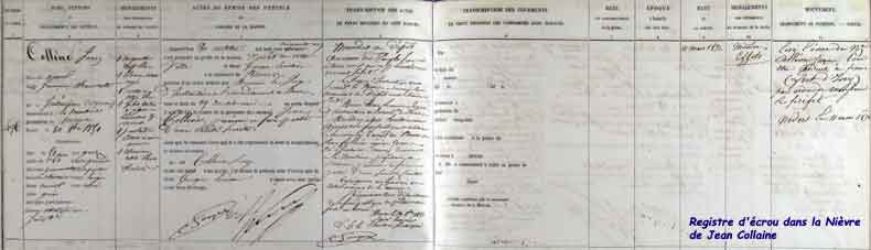 Activités politiques de Jean Collaine vers 1848-1852 La Nièvre est un département " rouge " où les républicains se sont organisés en sociétés secrètes (réunions d'association interdites) comme dans toute la France, pour défendre la jeune république de 1848. Jean Collaine doit faire de la politique à cette époque ou être en rapport avec ces groupes politiques qui s'organisent pour les futures élections de 1852. Les documents de police relatant son arrestation en 12/1851 indiquent : " est souvent dans les cabarets " (pour des réunions politiques) et dans une lettre de demande de grâce rédigée en 5/1852 il dit : " avoir refusé de voter en 48 pour Cavaignac, et avoir distribué des bulletins pour Louis Napoléon Bonaparte " sans doute parce que Cavaignac venait de faire tirer sur les manifestants à Paris. Mais l'élection de LNB en 1848 sera immédiatement suivi de mesures de restrictions du suffrage universel (obligation d'être domicilié 3 ans, ce qui excluait les itinérants soit environ 3 millions d'ouvriers..) et sera certainement la cause de son engagement avec les républicains. Arrestation à 51 ans Jean Collaine est arrêté le 28/10/1851 en tant que chef de Société Secrète en prévision du coup d'état de Louis Napoléon Bonaparte de 12/1851. Il est conduit à la prison de Nevers le 29/10/1851 (selon le registre d'écrou de la prison). [1].